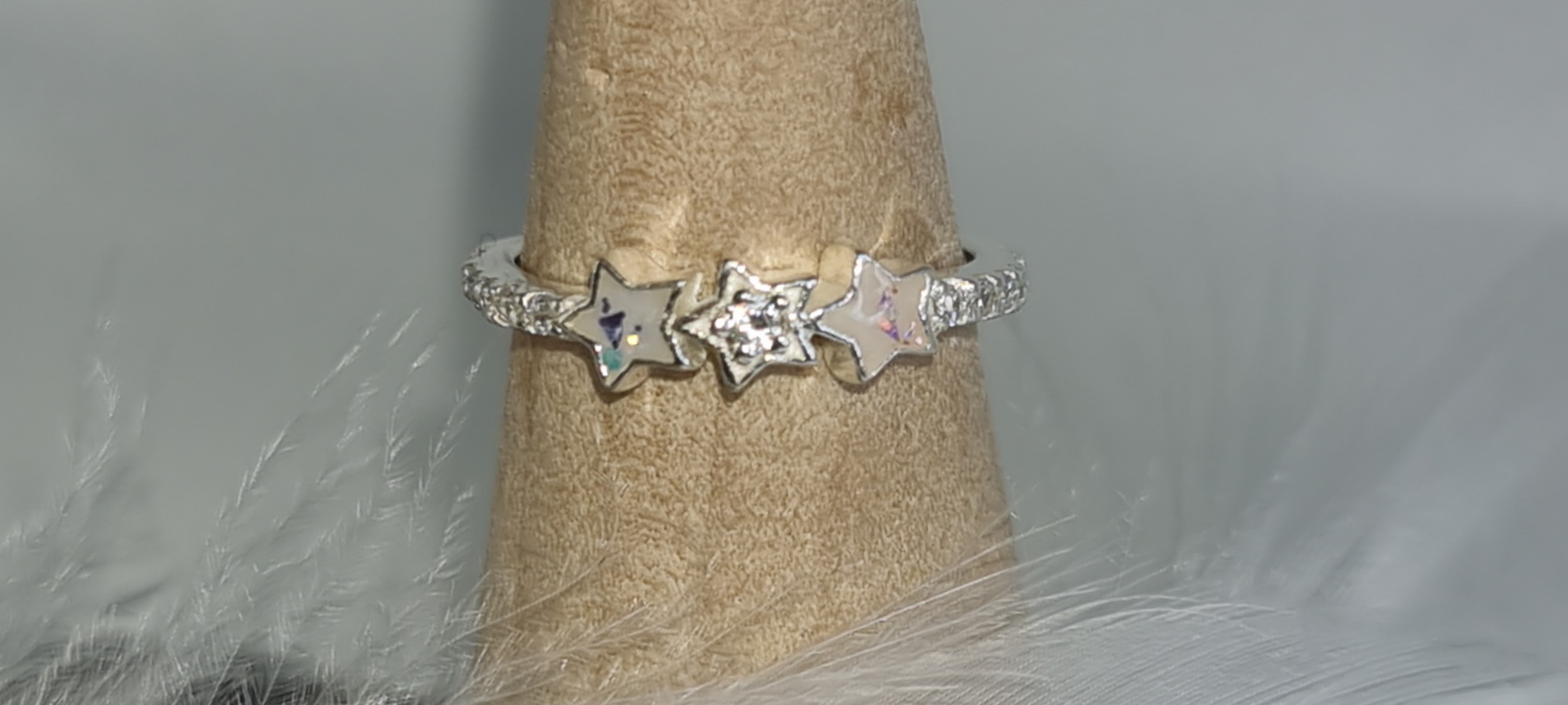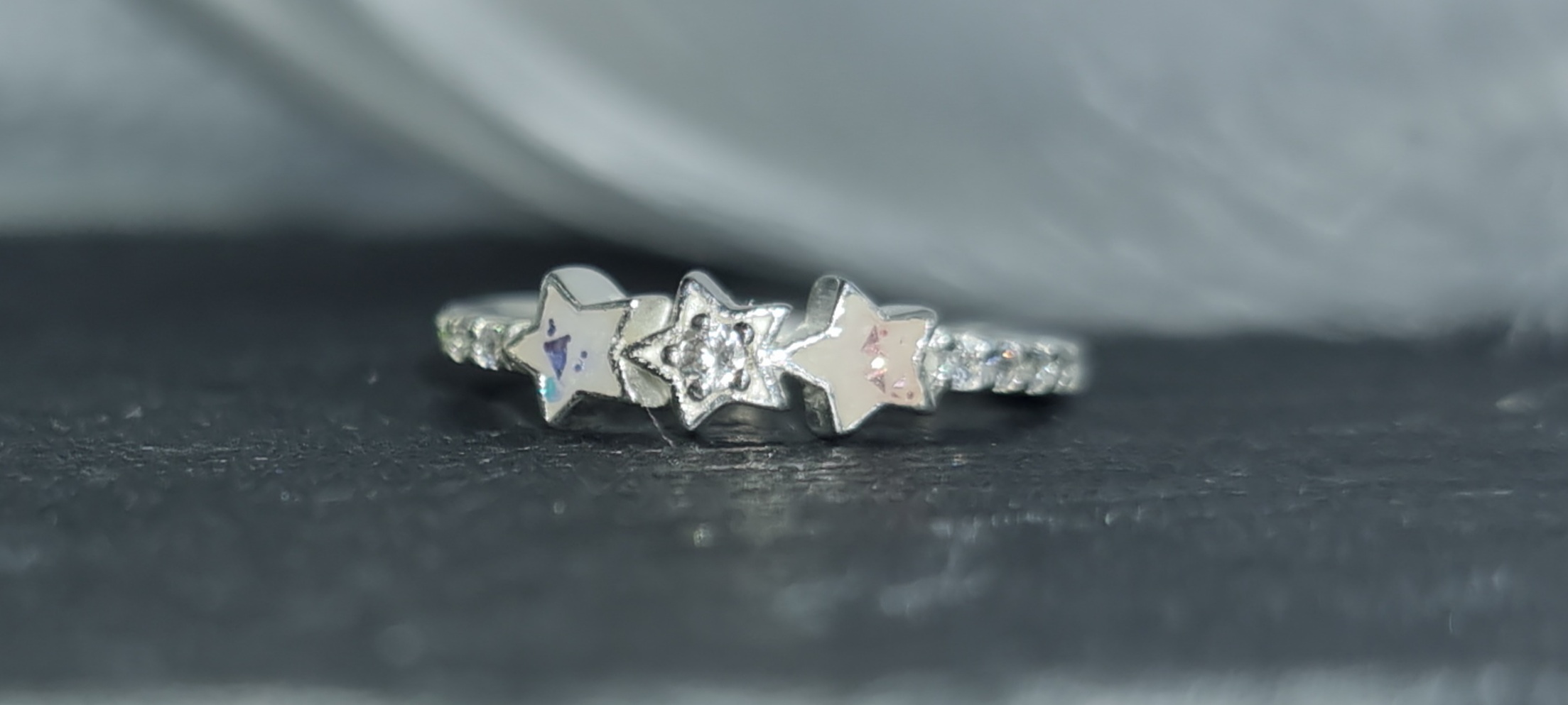 This stunning Minima Stella ring comprises of 3 tiny stars and is solid sterling silver with cubic zirconia stones. This can be set with your choice of precious inclusion.