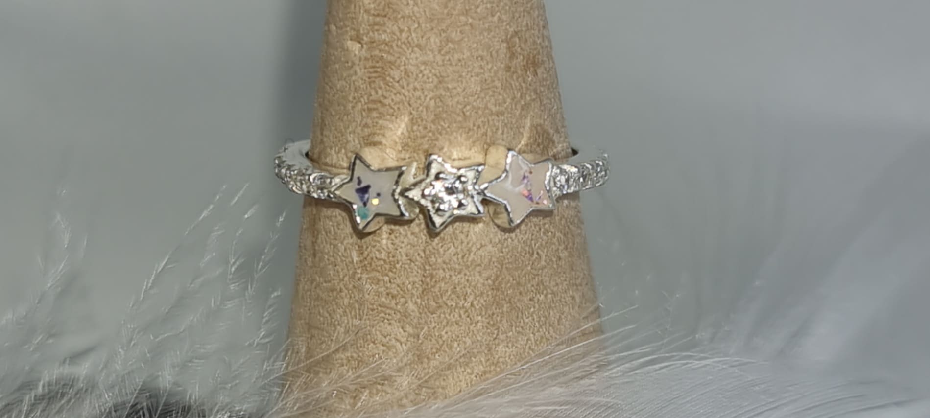 This stunning Minima Stella ring comprises of 3 tiny stars and is solid sterling silver with cubic zirconia stones. This can be set with your choice of precious inclusion.