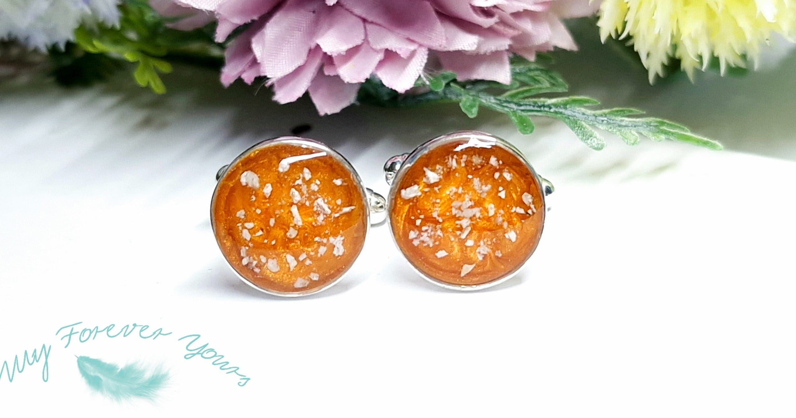 These beautiful Solid Sterling silver cufflinks with your choice of precious inclusion, are carefully and safely encapsulated with resin. The cufflinks are approx. 13.8mm in diameter and can be set in a range of colour options.
